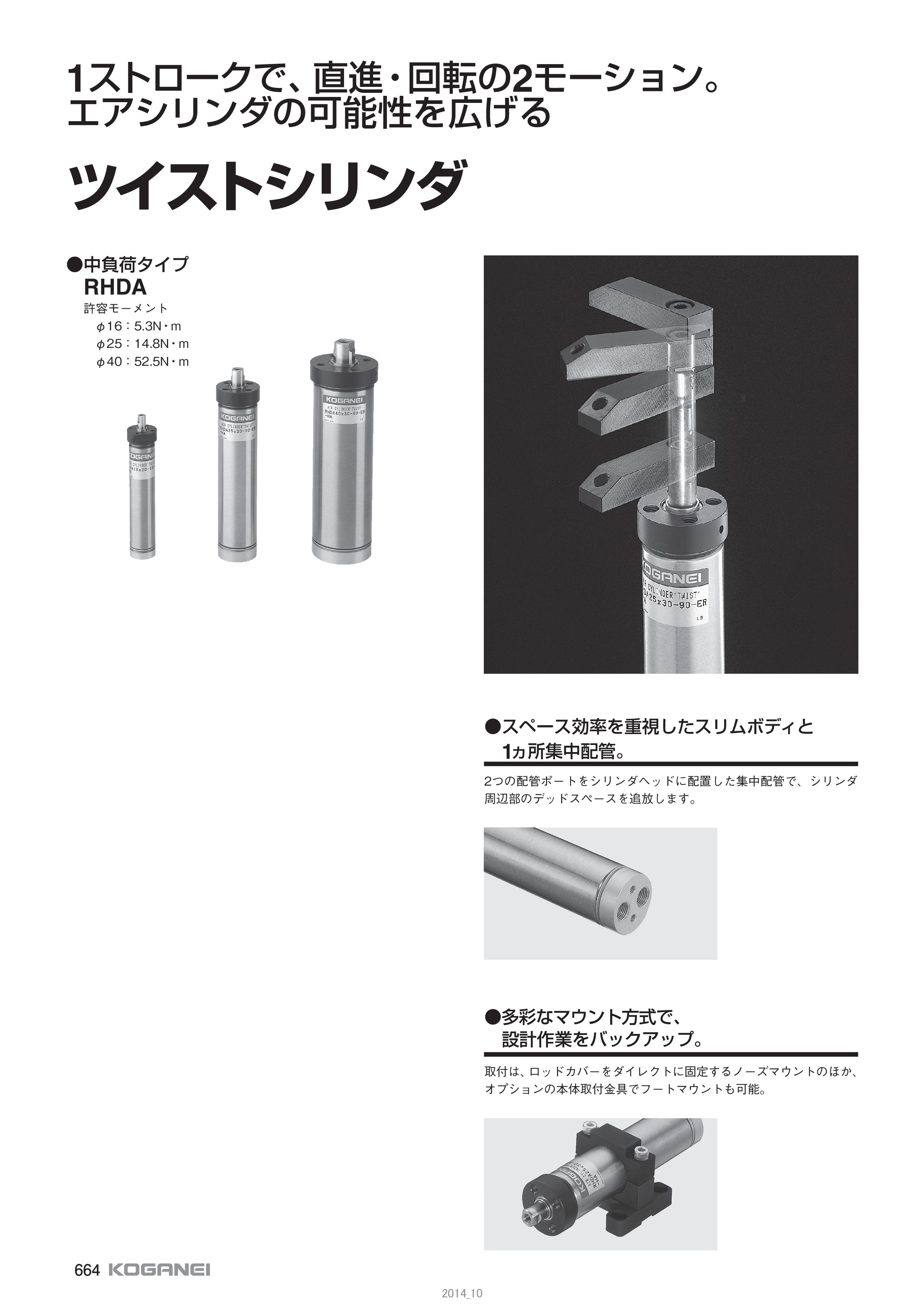 ●シリンダ径Φ16~40 ワンアクションで、ロッドが直進と同時に90度回転。スリムなボディと、1カ所集中配管の省スペース設計。
