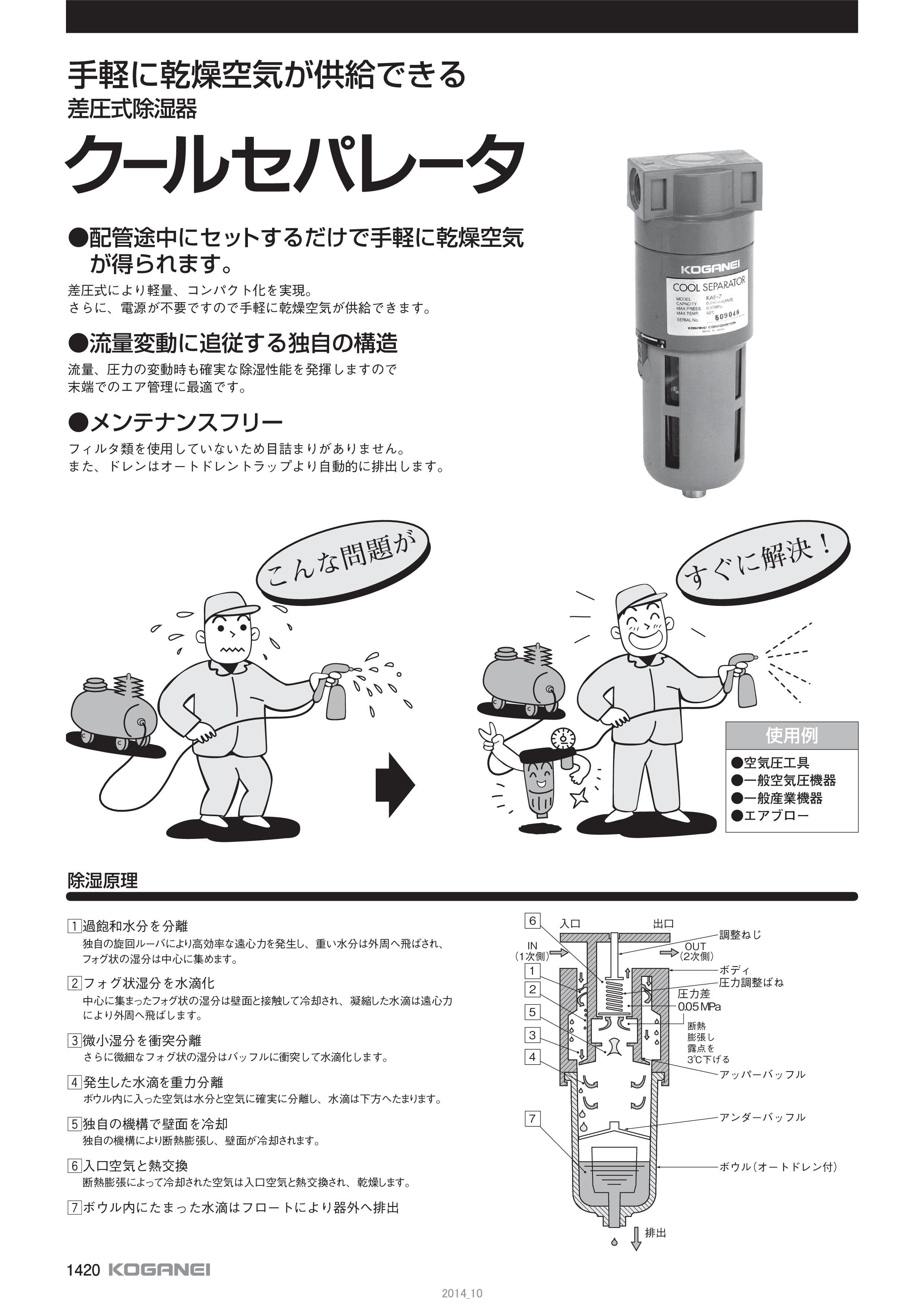 ●業界初の差圧式により軽量、コンパクト化を実現。流量、圧力の変動時も確実な除湿性能を発揮します。ドレンはオートドレントラップより自動的に排出します。