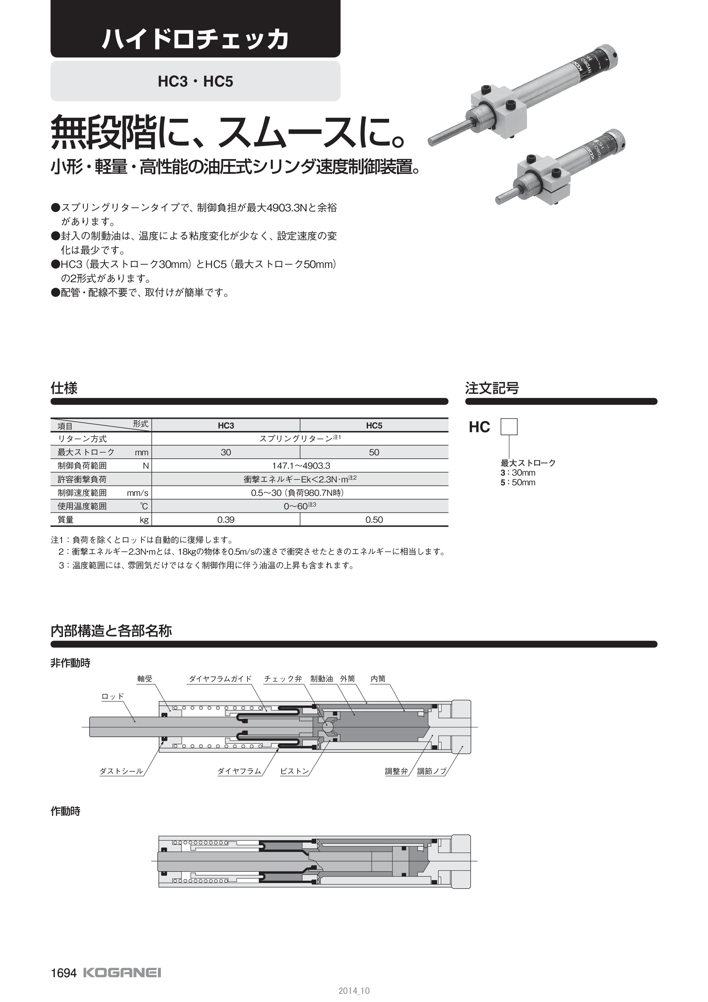 ●高速から低速まで、シリンダ速度を油圧で無段階にコントロール。油もれがない完全密封のメンテナンスフリー。速度調節が簡単、安定した速度制御が可能。