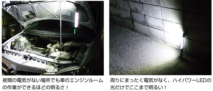 暗闇を明るく照らしだし、屋外での夜間作業や交通整備、明るさの不十分な倉庫内の補助ライトなど様々な場面で活躍します。 夜間の電気がない場所でも車のエンジンルームの作業ができる程の明るさです。