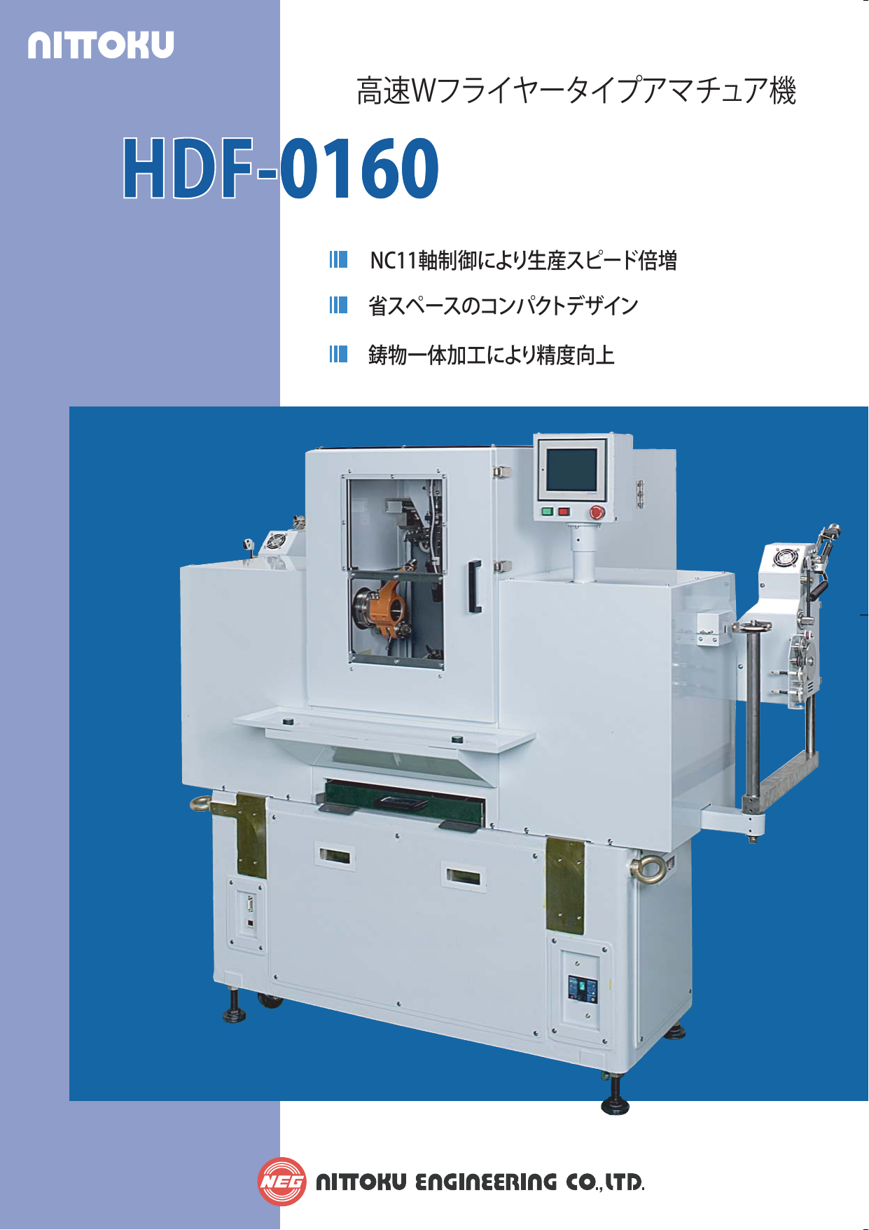 ダブルフライヤーアマチュア巻線機DF-0150、DF-0150Vは、日特オリジナル超高速コントローラーの搭載により、コンパクトでシンプルな機構に加え、NC7軸により仕様替えに対するフレキシブルな対応を可能としました。また、DF-0160は、NC軸を4軸増やした11軸を搭載し、DF-0150と比較して巻線やフッキング等のスピード倍増を実現した、パワーアップモデルです。