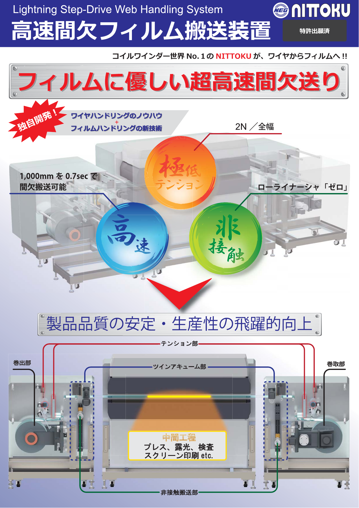 | 装置仕様 | ■搬送方法:連続搬送 / 間欠搬送 ■連続搬送能力 ・RtoR実験機A:~ 40m/min ・RtoR実験機B:~ 50m/min ■間欠搬送能力 ・RtoR実験機A:~1000mm/0.3sec ・RtoR実験機B:~1000mm/0.7sec ■間欠送りピッチ ・RtoR実験機A:~450mm ・RtoR実験機B:~800mm ■テンション値 ・RtoR実験機A:2N~18N ・RtoR実験機B:10N~100N※お客様の仕様に調整可能です、ご相談ください 『高速間欠フィルム搬送装置(ロール・ツー・ロール/Roll to Roll)』 実験機をご用意してあります。これは「基材変形がシビアな素材」や「極低テンション」を要求されるお客様に効果的な実験装置になります。 また実機製作時には、種々多様な要求にも対応(オンリーワンシステムのご提案)させて頂きますので、 ご要望不明点等ございましたら、お気軽にお問い合わせ願います。 |
