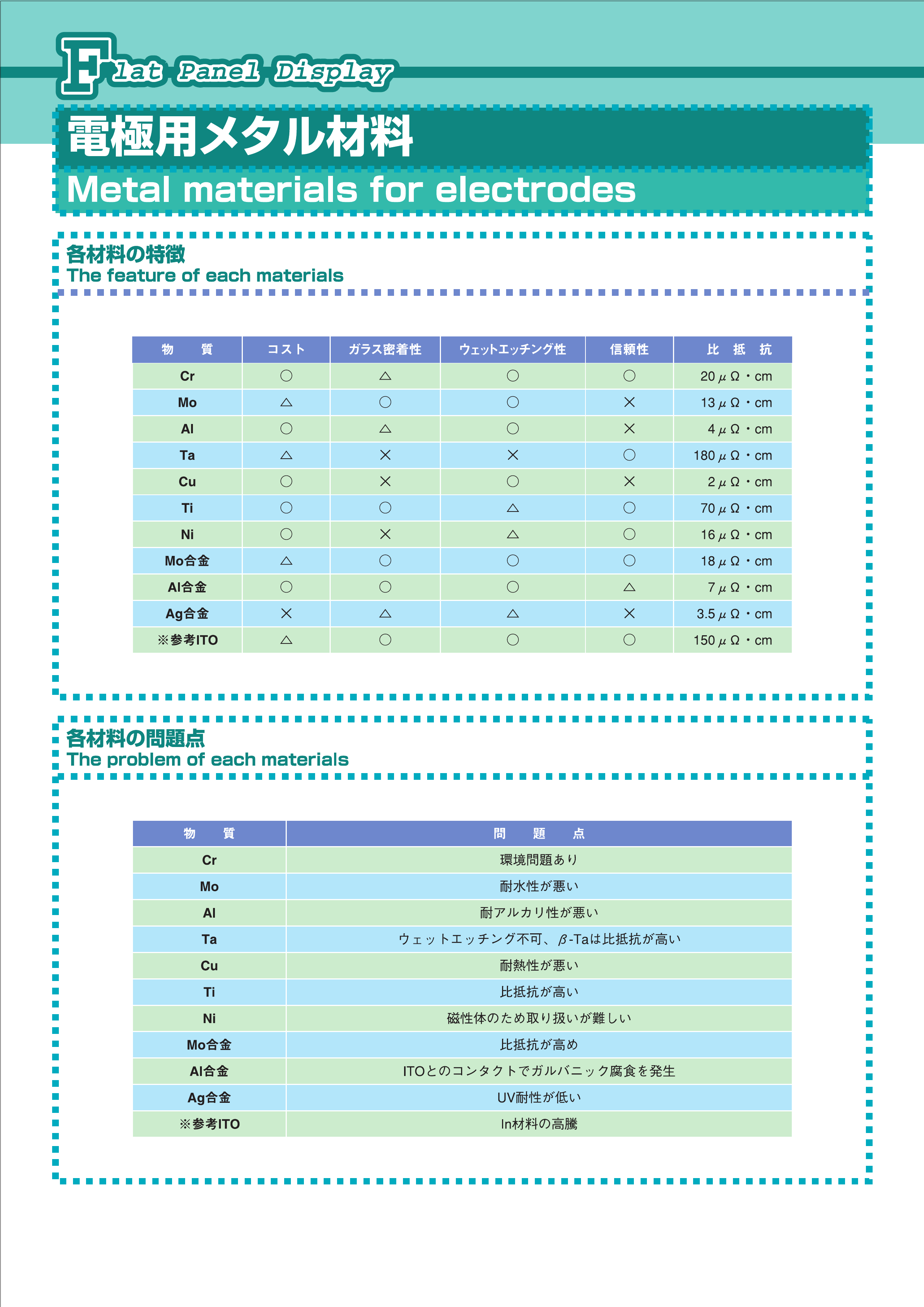 表示エリアのパターン微細化に伴い、電極本数も増加しております。これに対応するために、抵抗値、エッチング性、信頼性に優れた、Ag系、Al系の電極材料をご提供致します。
