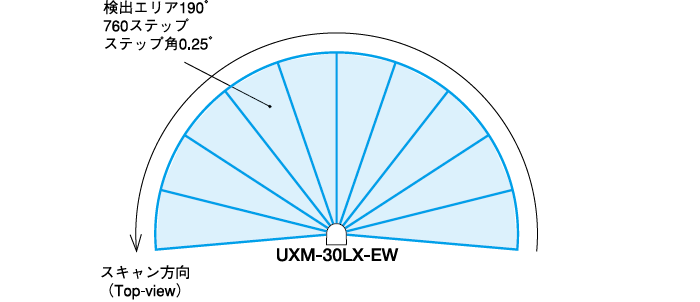 | 測距範囲 | ○検出保証値:0.1~30m※1(黒10%反射物 500mm□) ○最大検出距離:100m(出力限界値) 角度:190° ※環境の影響は実機での確認をお願いします。 |