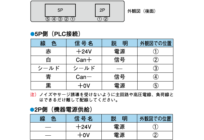 | 接続 | コネクタ:5ピン(PLC接続用)、2ピン(別電源供給用) |