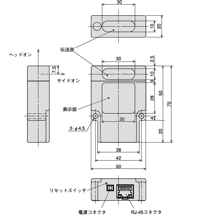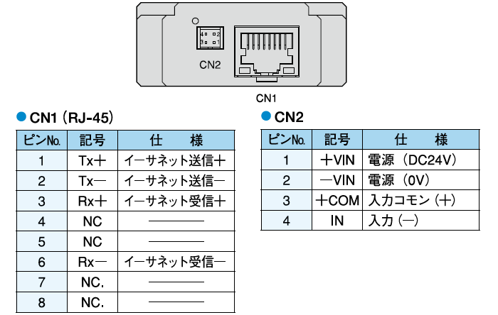 | 接続 | コネクタ式〔CN1:イーサネット(モジュラジャックRJ-45)、CN2:電源・入力〕※CN2のみケーブル(ケーブル長2m)が付属しています。 |