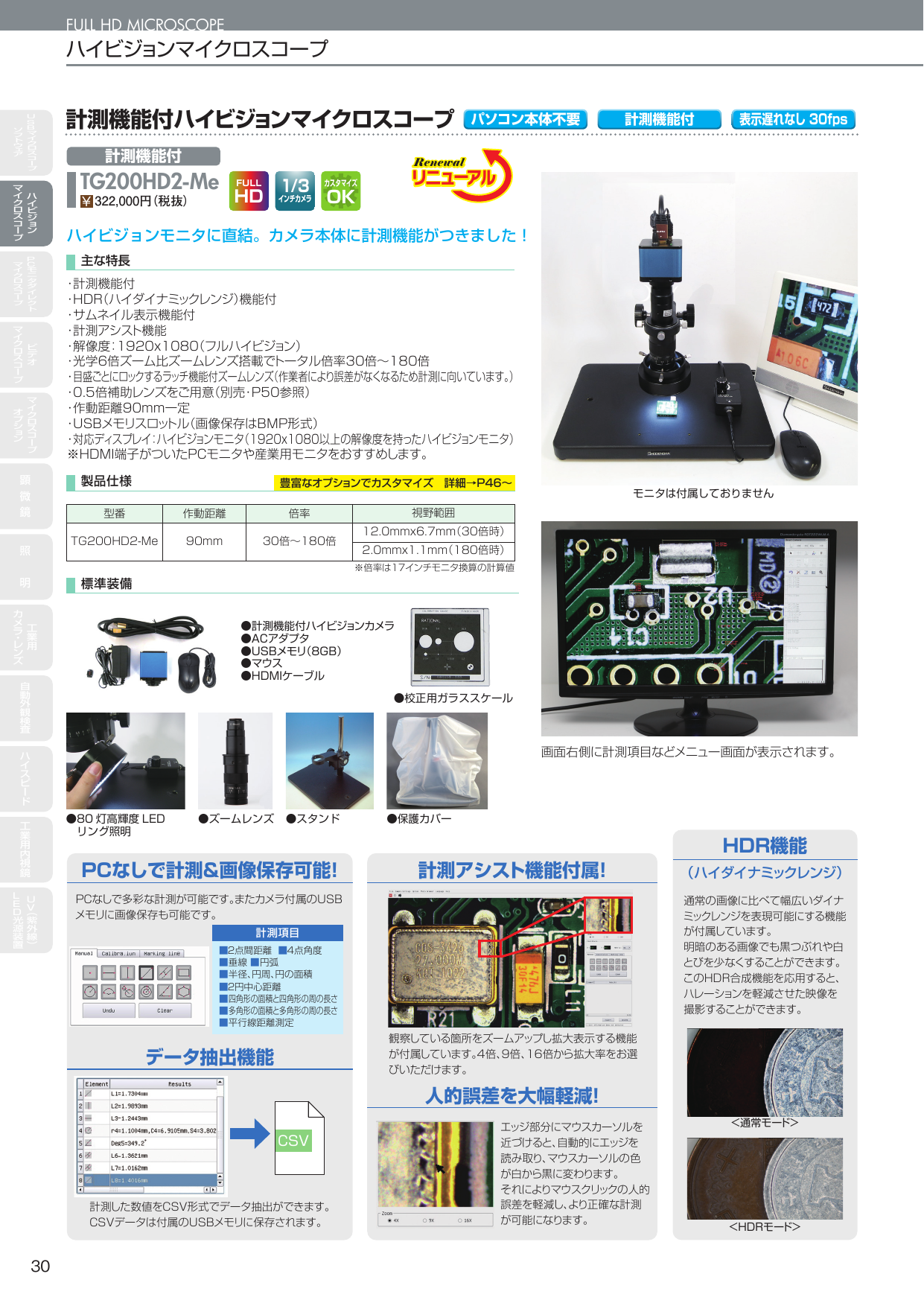 | 主な特長 | 計測機能付 HDR(ハイダイナミックレンジ)機能付 光学6倍比ズームレンズ搭載でトータル倍率30倍~180倍 メモリごとにロックするラッチ機能付ズームレンズ 0.5倍補助レンズをご用意(別売) 作動距離90mm一定 解像度:1920x1028(フルハイビジョン) 表示遅れのない滑らかな映像(30fps) USBメモリスロットル付きで画像を簡単保存。(画像保存はBMP型式) 画像出力用のHDMIケーブルは標準付属しています。 |