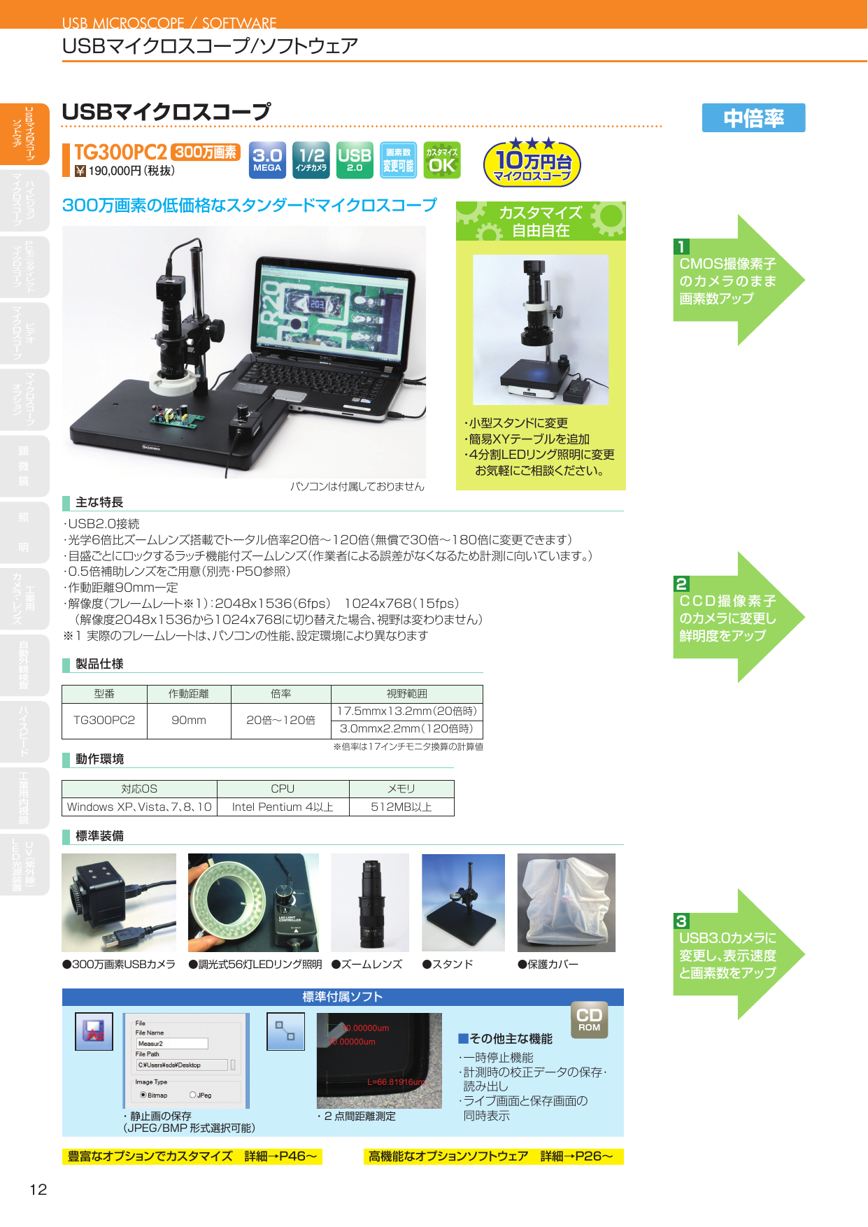 | 主な特長 | USB2.0接続 光学6倍比ズームレンズ搭載でトータル倍率20倍~120倍 目盛ごとにロックするラッチ機能付ズームレンズ(作業者による誤差がなくなるため計測に向いています) 0.5倍補助レンズをご用意(オプション) 作動距離90mm一定 解像度(フレームレート※)2048x1536(6fps)、1024x768(15fps) (解像度2048x1536から1024x768に切り替えた場合、視野は変わりません) ※1 実際のフレームレートはパソコンの性能、設定環境により異なります。 |
