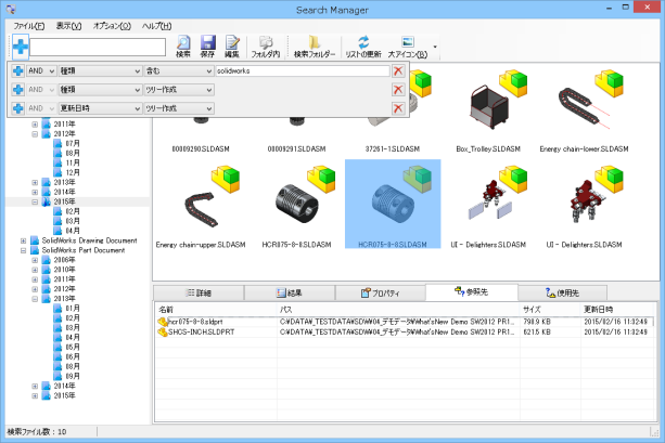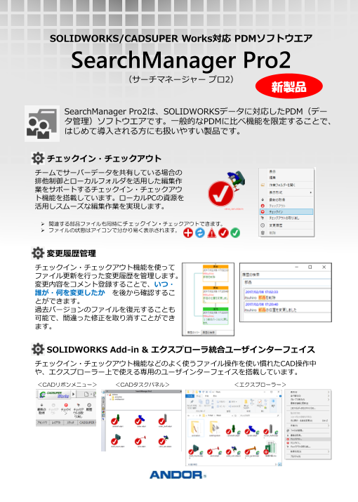 また、検索条件の保存・再利用や自動ツリー作成などの独自の機能に加え、グループでサーバーデータを共有して利用する場合の排他制御機能をサポートする チェックイン・チェックアウト機能や CADSUPERWorks/SOLIDWORKSデータを対象とした参照管理機能を搭載しています。