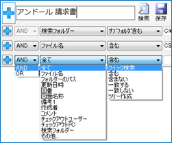 | 検索条件の保存と再利用 | よく使う検索条件には名前を付けて保存することができ、保存された検索条件を選択するだけで検索が実行出来ます。 |