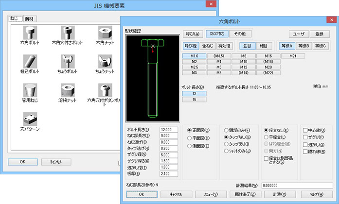 機械設計でよく利用するJIS標準機械部品のねじ・鋼材部品を標準搭載しています。配置したい部品形状と寸法を選択し、配置位置を選択するだけで簡単に部品配置することが出来ます。配置された部品の個数を集計して部品表を作成することやExcelと連携することも可能です。