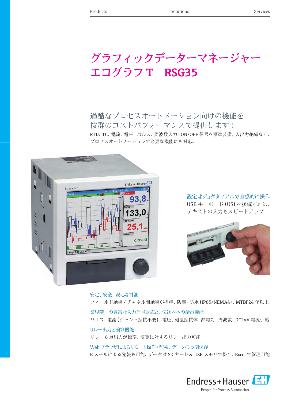 Ecograph T RSG35 は、アナログまたはデジタル入力信号の記録、可視化、監視を行います。 機器操作が簡単なだけでなく、コスト削減やデータ取得の単純化を実現。 様々な通信インターフェイスに対応のため、システムへのシンプルな組み込みが可能。