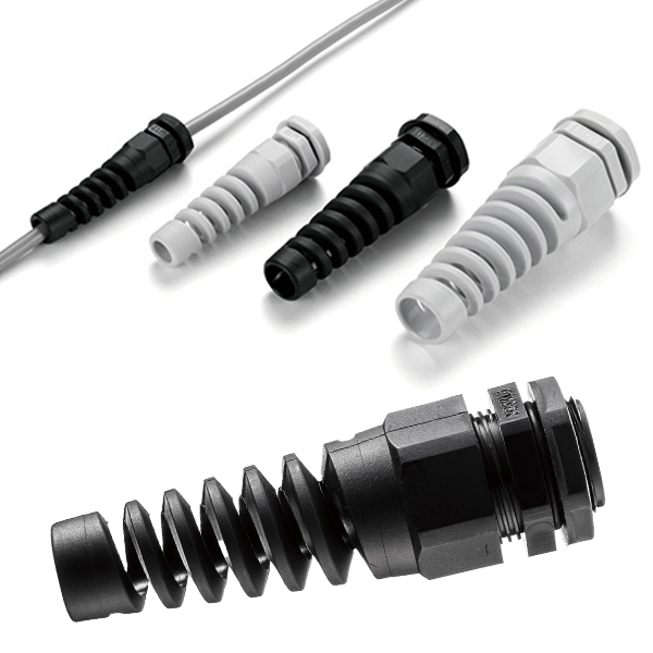 ・屈曲保護付きMねじケーブルグランド。ケーブルの過度の屈曲に対して保護が出来ます。