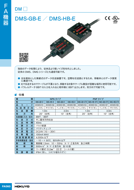 | 伝送距離 | 1.0mタイプもしくは3.0mタイプ ※DMS-G/HB1/2-Eタイプ以外の1m/3m仕様品と通信する場合、伝送距離がそれぞれ0.6m/1.8mになります |