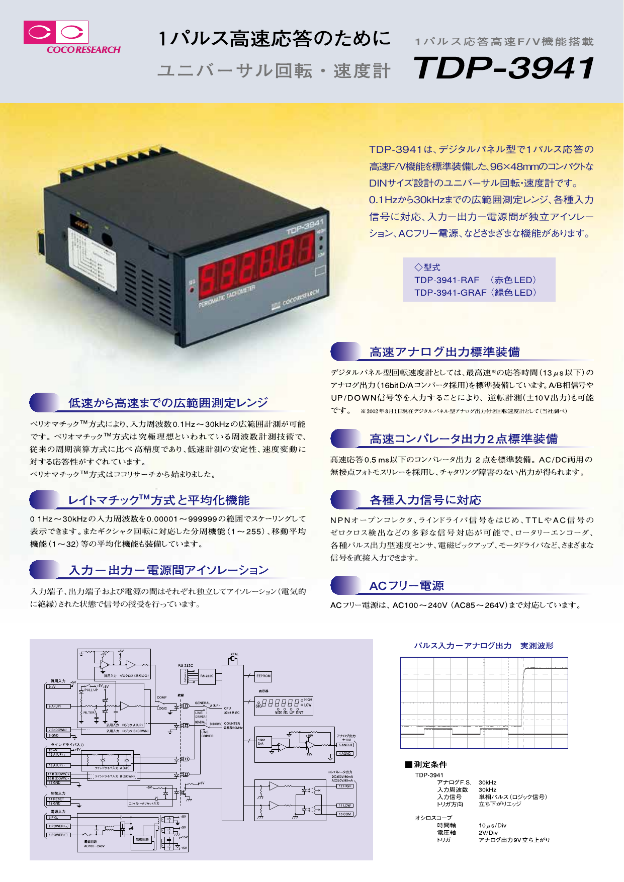 デジタルパネル型で1パルス応答の高速F/V機能を標準装備、96×48mmのコンパクトなDINサイズの回転・速度計です。 0.1Hz~30kHz広範囲測定レンジ、高速コンパレータ出力2ch標準装備、各種信号入力対応、入力-出力-電源間が独立アイソレーション、ACフリー電源、などさまざまな機能があります