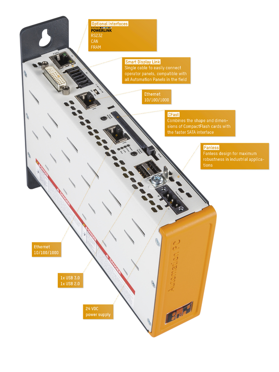 Panel PC 2100は2xギガビット・イーサネット1x USB 2.0 、1x USB 3.0など重要なインターフェースをすべて備えています。 POWERLINKやCANなどのフィールドバス・テクノロジーを利用するためのインターフェース・モジュールを追加することもできます。 データストレージについてはMLCベースのCFastカードが利用でき、60GB以上も保存可能です。