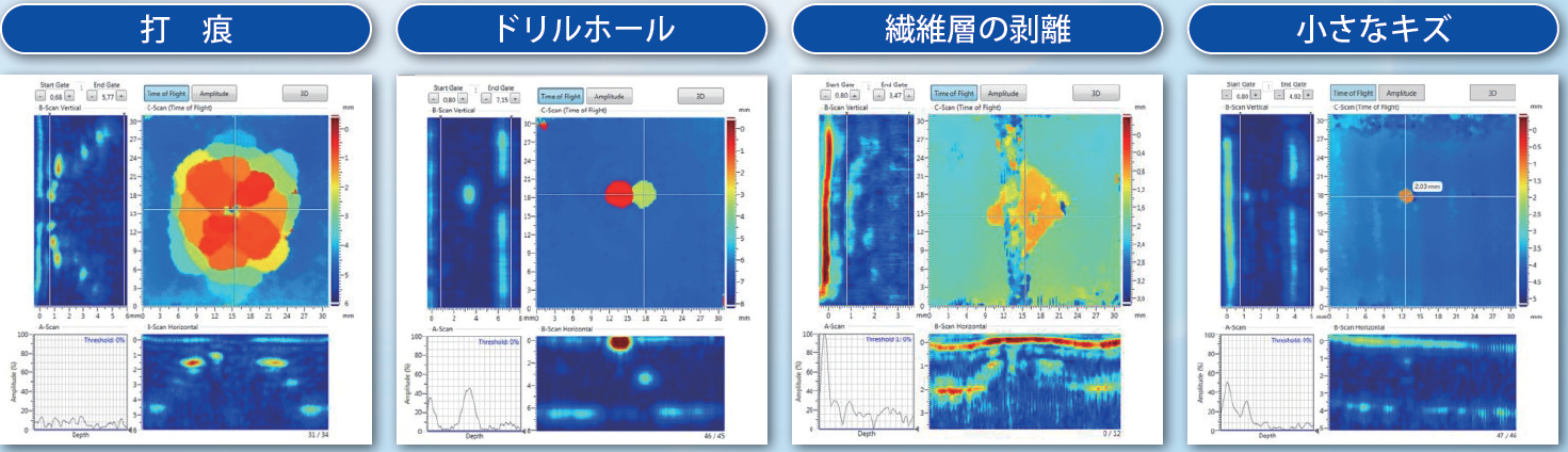 | 主な用途 | CFRP内部に発生する「打痕」や「剥離」、「割れ」等が検出可能です。 |