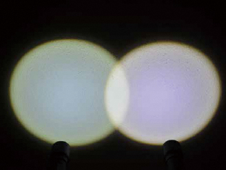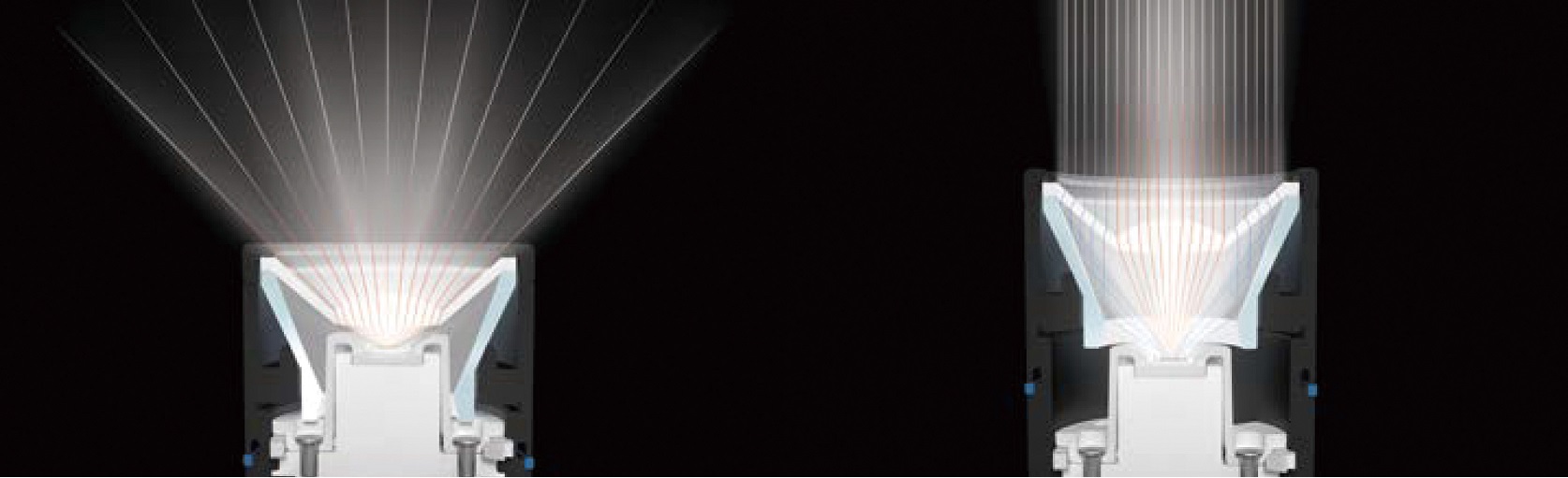 ヘッドを前方に押すことにより、LED光源がリフレクターレンズの背部に移動。レンズにより偏向、集約された光は束になり、細いビームとなる。集約されなかった光もリフレクター表面で偏向され、前方に同じく活用照射。 光束となり、同じ距離の対象物に対して拡散ビーム照射と比較し、ルーメン数が増加する。 遠距離照射時や強力照射が必要な場面に役立つ。