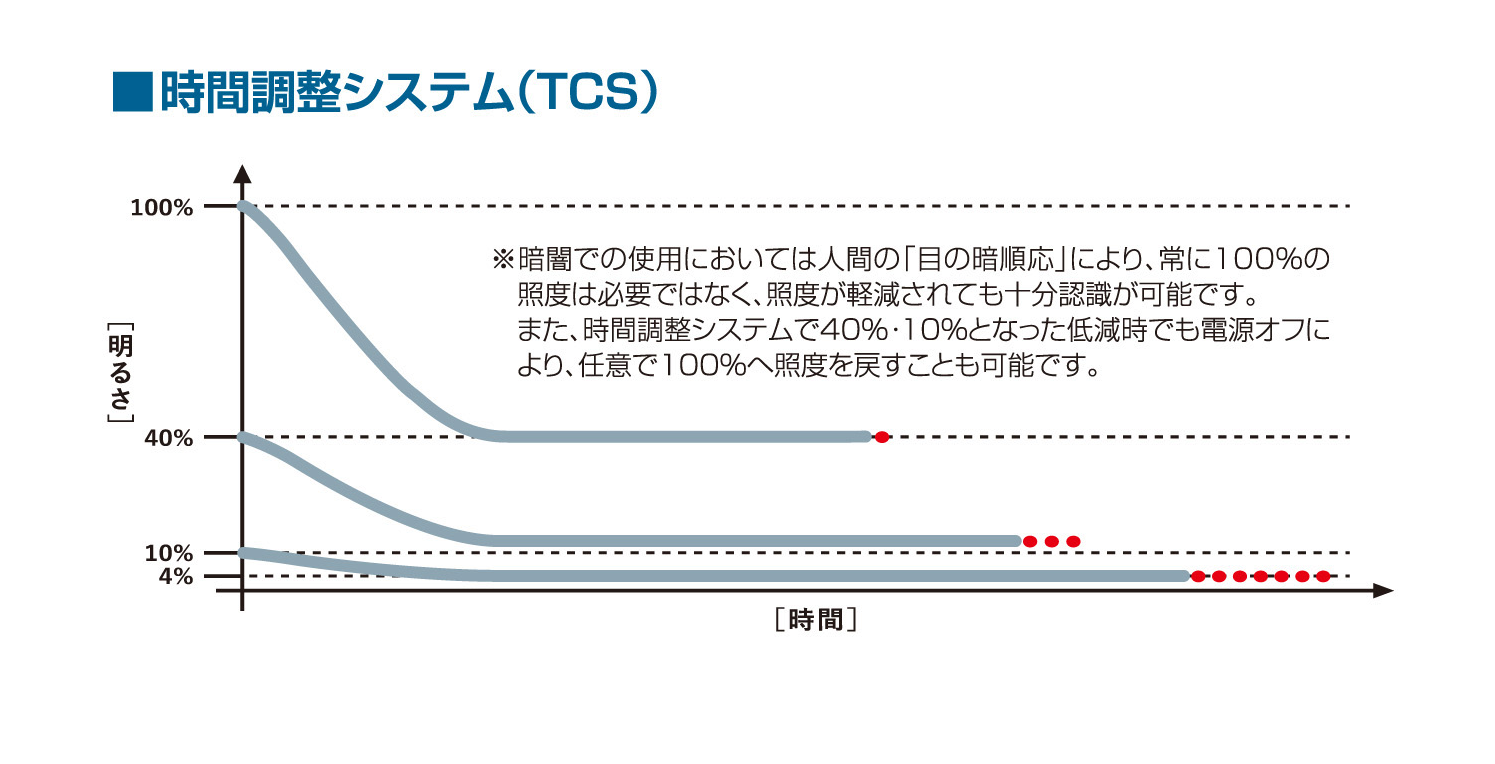 また、時間調整システムで40%・10%となった低減時でも電源オフに より、任意で100%へ照度を戻すことも可能です。