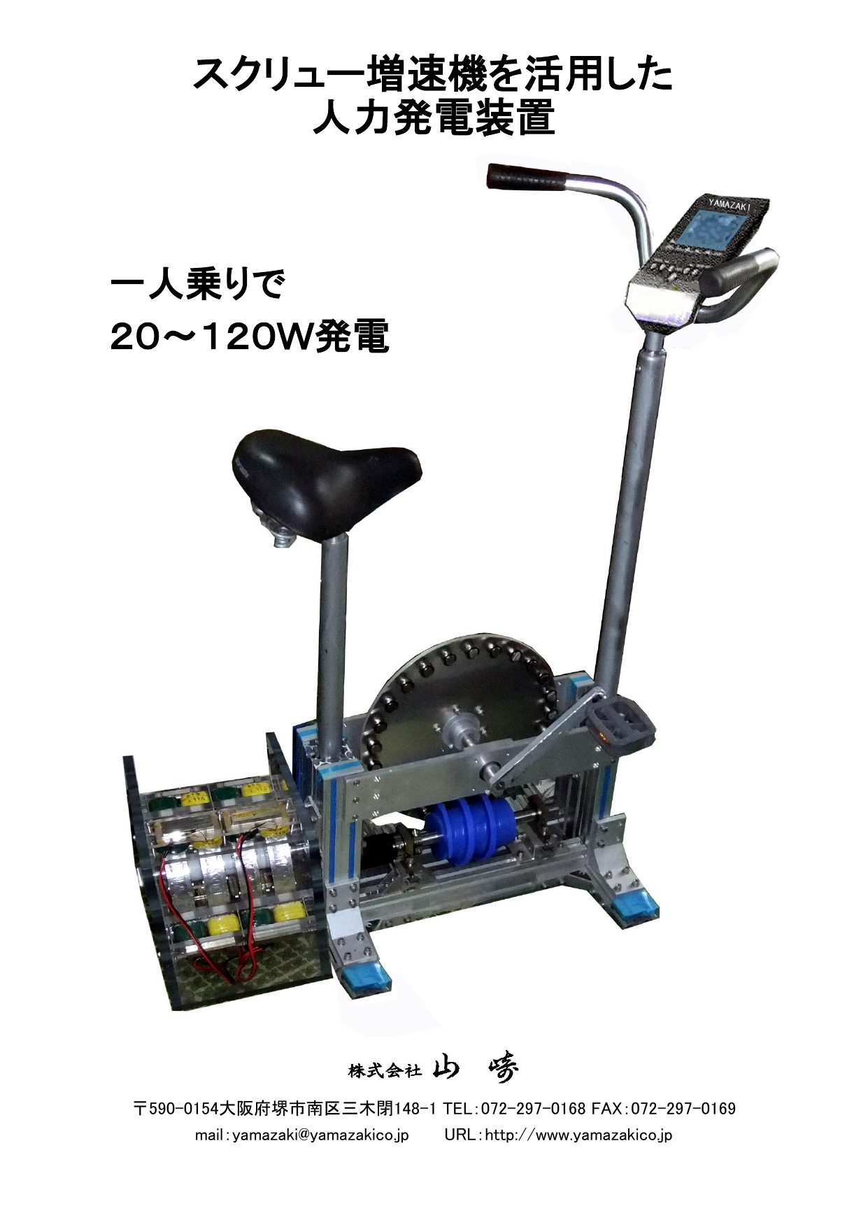 従来は減速でしか用いられなかったウォームギヤ方式での増速を可能にしたスクリュー増速機を採用した人力発電装置。一人乗りで20~100Wの発電が可能。
