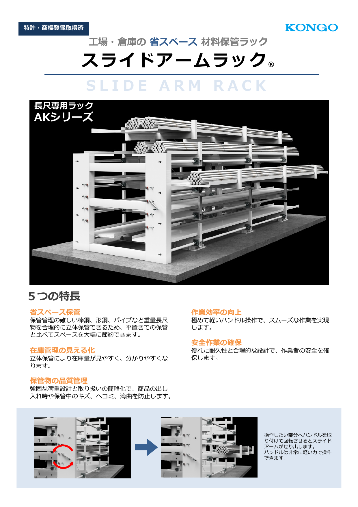長尺重量物の管理保管を目的に開発したスライドアームラック。