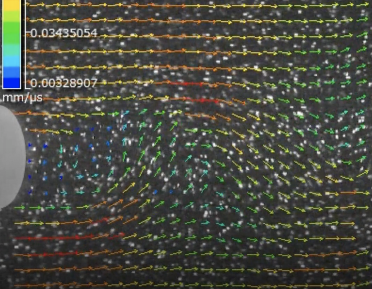 弊社の高速度カメラを使い、気体、液体の流れを可視化させて、流速をベクトル表示、数値化します。