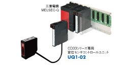 三菱電機MELSEC-Qシリーズに接続できる変位センサコントロールユニットUQ1-02誕生!通信設定が一切不要な上、専用ソフトウェア「UQ1 Navigator」により、誰でもカンタンに短時間で設定することが可能です。※CD33シリーズのRS-422タイプで使用可。