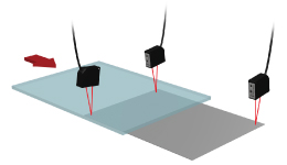 正反射型の変位センサCD33-L30で、マスクの高さを制御するとともにガラスの厚みを測定します。マスクまでの距離を3点測定し最適な高さに調整、その後ガラス基板がその上を通過するときに厚みを測定します。透明度の高いガラス基板なら変位センサ2台で挟み込んで測定しなくても安定した厚み測定が可能です。