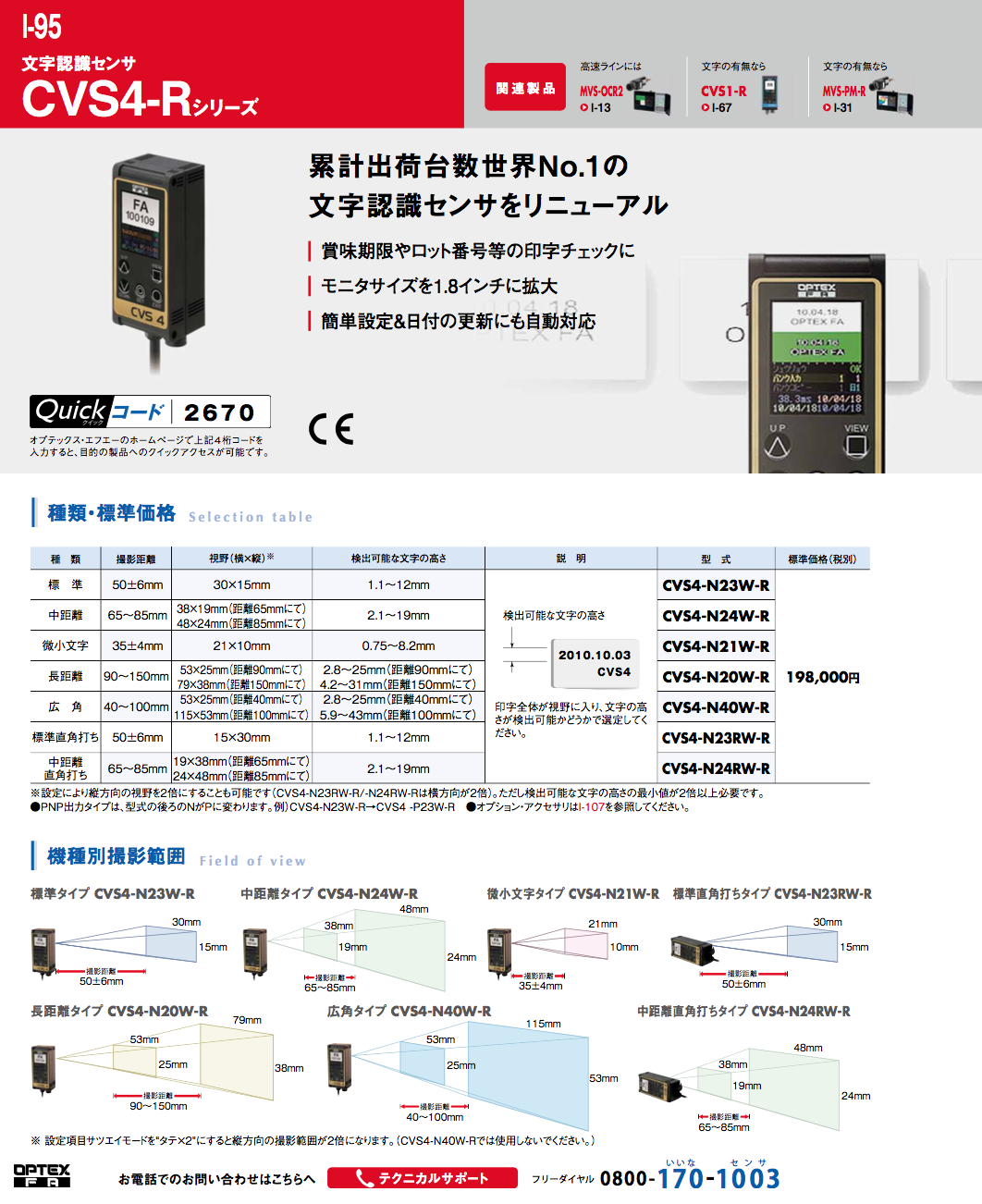 | 撮影距離(撮影範囲) | 標準:CVS4-N23W-R:50±6mm(30×15mm) 中距離:CVS4-N24W-R:65〜85mm(38×19〜48×24mm) 微小文字:CVS4-N21W-R:35±4mm[±10%](21×10mm) 長距離:CVS4-N20W-R:90~150mm(53×25~79×38mm) 広角:CVS4-N40W-R:40~100mm(53×25~115×53mm) 標準直角打ち:CVS4-N23RW-R:50±6mm(15×30mm) 中距離直角打ち:CVS4-N24RW-R:65〜85mm(19×38〜24×48mm) |