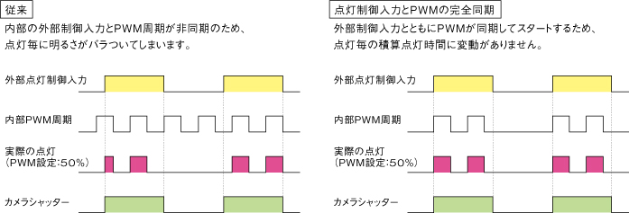 | 調光制御 | OPPD-15:PWM調光方式 周波数:100kHz 1,000ステップ OPPD-15-f500:PWM調光方式 周波数:500kHz 200ステップ 5ステップの数値表示(0,5,10,15,…,995) OPPD-15-f1M:PWM調光方式 周波数:1MHz 64ステップ 15ステップの数値表示(0,15,30,45,…,990) |