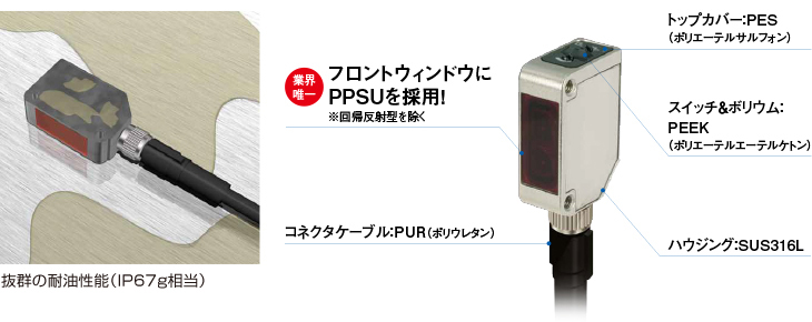 透過型・拡散反射型は、業界で唯一、PPSU(ポリフェニルサルフォン樹脂)を採用。業界で多く採用されているPMMA(アクリル樹脂)よりも高い耐油性を示します。コネクタ式のケーブルには、耐油性が非常に優れたPUR(ポリウレタン)を採用。