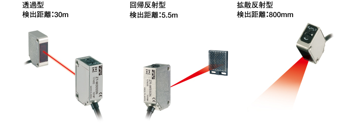 | 検出距離 | 透過型:ZT-M3000□:30m 回帰反射型:ZR-M550□:0.01~5.5m 拡散反射型:ZD-M80□:0~800mm |