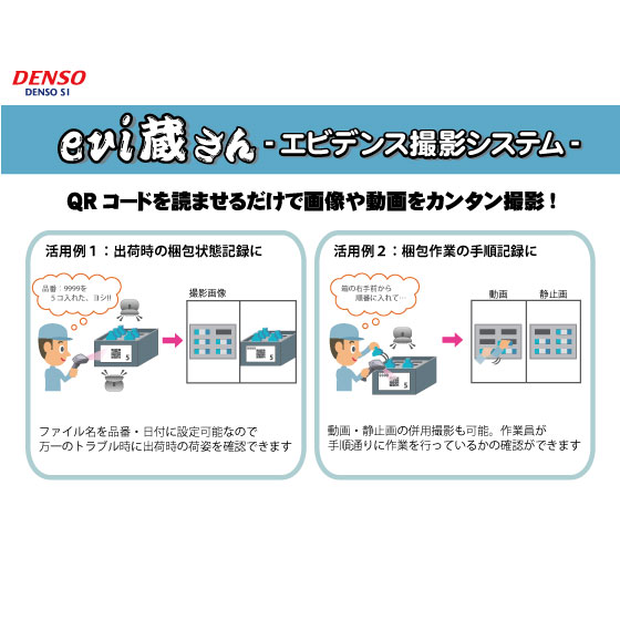 「evi蔵さん」は、QRコードを読ませるだけで画像や動画をカンタンに撮影することができるシステムです。 作業効率を落とす事なく現品の梱包状態や作業手順の記録ができます...