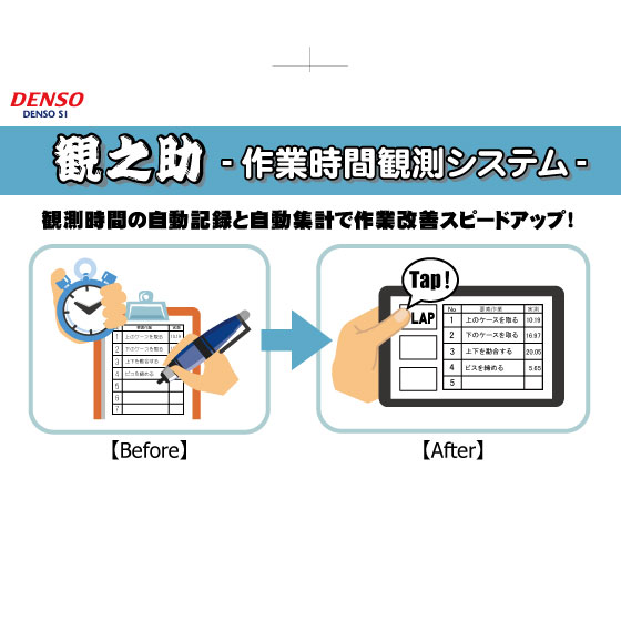 「観之助」は、観測時間の自動記録と自動集計で作業改善スピードアップを実現する作業時間観測システムです。 観測作業はタブレット上でタップするだけ。 ストップウォッ...