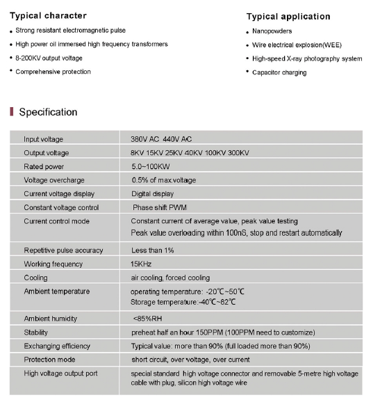 Input voltage:380V AC 440V AC Output Voltage:8KV 15KV 25KV 40KV 100KV 300KV Rated power:5.0~100KW Voltage overcharge:0.5% of max. voltage Current voltage display:Digital display Constant voltage control:Phase shift PWM Current control...