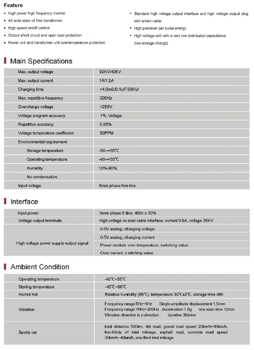 Max.output voltage:50KV/ 40KV Max.output current:1.0A/1.5A Charging time:<4.0mS(0.1uF/50KV) Max.repetitive frequency:200Hz Overcharge voltage:<250V Voltage pr...