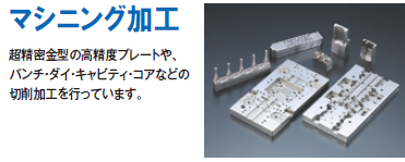 超精密金型(プレス・モールド)の高精度プレートや、パンチ、ダイ、キャビティ、コアなどの切削加工を行っています。SKD11の加工が中心ですが、SS400やS50C、アルミ材のダイセットやモールドベースの加工も承ります。
