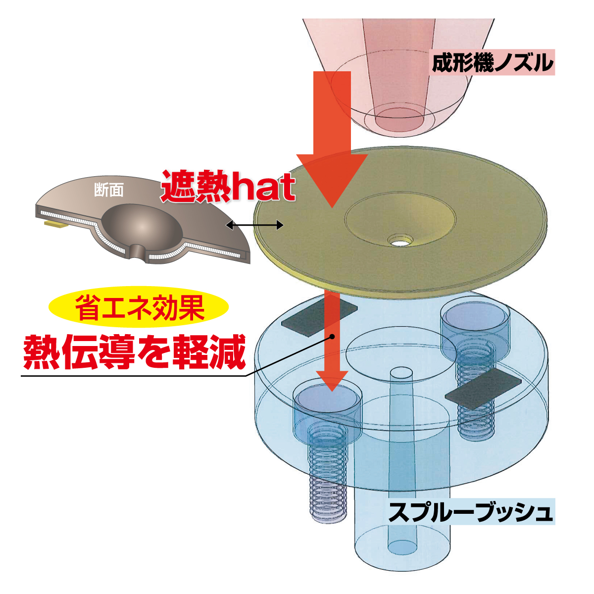 「遮熱hat」は、プラスチック射出成形機のノズルと金型の間に装着し、双方の熱移動を抑える遮熱・断熱部品。 樹脂の糸ひき防止や、成形品質の安定による成形不具合品の削減、...