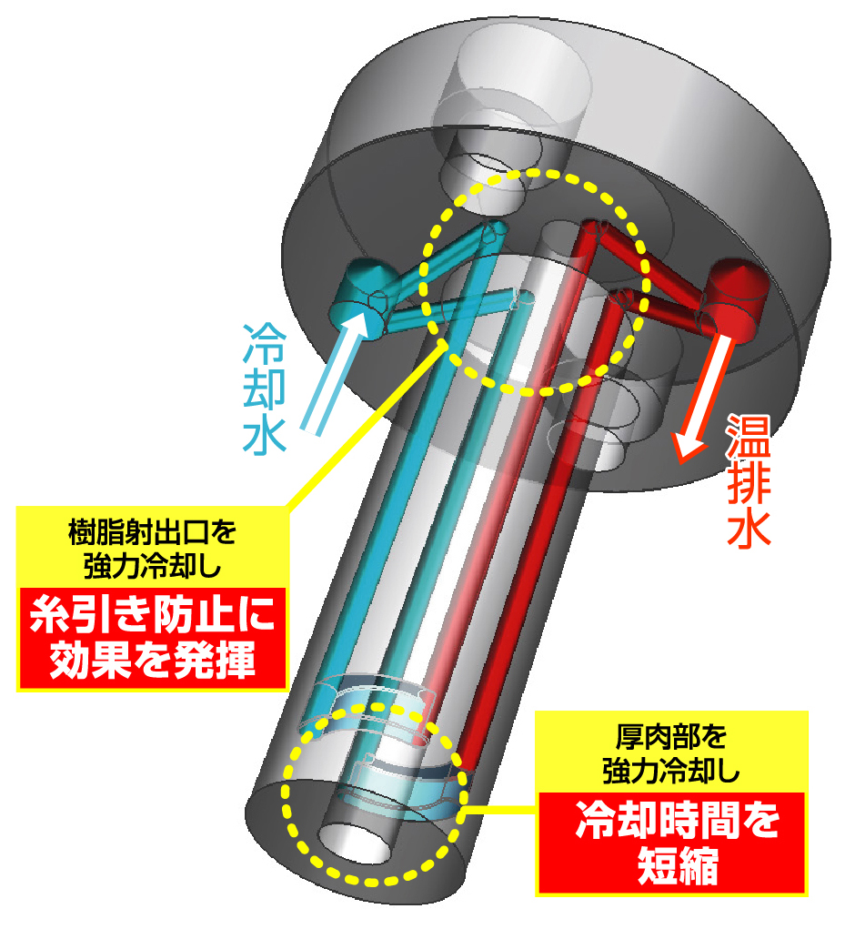 小物薄肉成形品の冷却時間を短縮、樹脂の糸引き防止にも有効